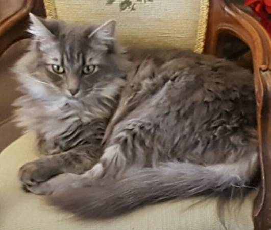 Lily is a delicate grey cat with very soft fur. She was only about 8 pounds lots of hair and a very long fluffy tail. In winter, she grows a long man and Summer. She looks much thinner because she has less hair.. she would be growing her winter coat by now. She has a littermate and he misses her and we’ve been together for 10 years. An unfortunate situation happened when I was out of town she had care, but then someone came and stayed at my house without permission with their dog and scared them away..