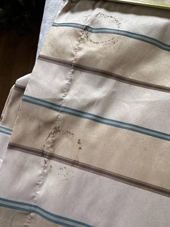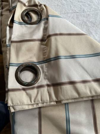 Two lined curtain panels of striped fabric with large grommets at the top. The grommets are a bit corroded and did leave some stains along the bottom that are shown in the second photo. They are 53" wide and 93" long. If you want them, let me know when you will pick them up and I will leave them on my porch. They must be picked up between 8:00 am and 8:00 pm.