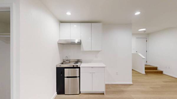 - Mini Kitchen equipped with stainless-steel fridge, electric stove and kitchen hood