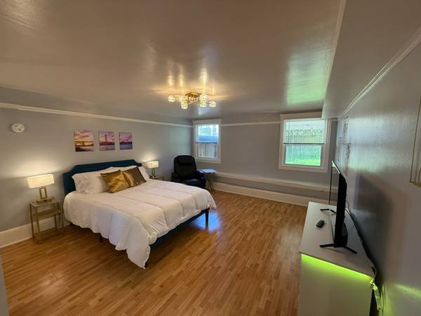 2. Bedroom: queen bed, 2 nightstands, massage chair, dresser, smart TV, decorated with San Francisco themed artwork.