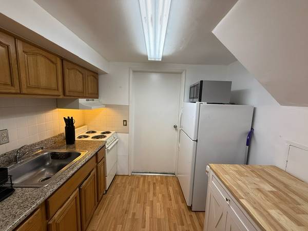 4. Kitchen with electric stove, refrigerator; microwave, coffee maker, pots and pans, dishes, silverware.