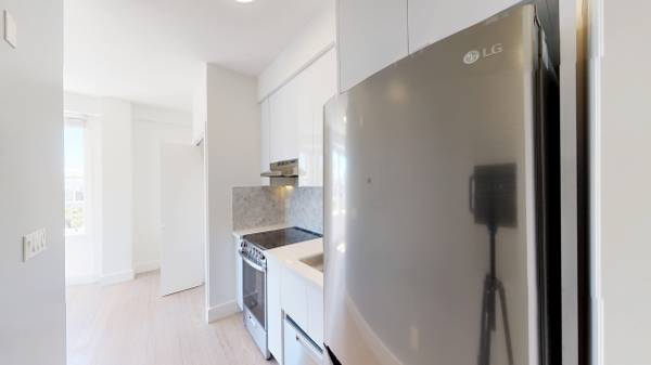- Kitchen with stainless steel appliances, including dishwasher, refrigerator, and stove