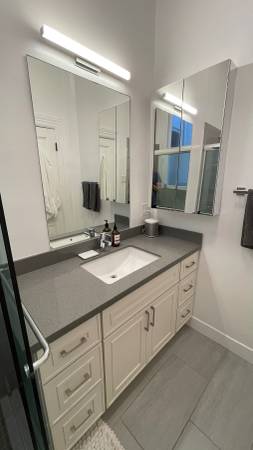 - New kitchen with quartz countertops, new tile floors, stainless steel appliances including dishwasher and garbage disposal