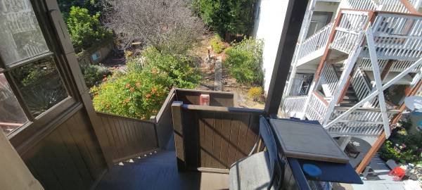 Apartment has rear stairs to a very sunny shared backyard.