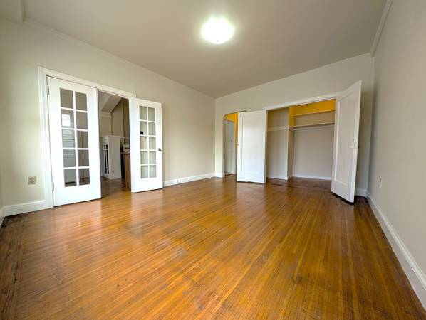 French glass doors elegantly divide the kitchen from the living room, and the unit includes two closets—one of which is a spacious walk-in. The bathroom is newly "remodeled" and has a shower over the tub, along with a foyer and hallway.