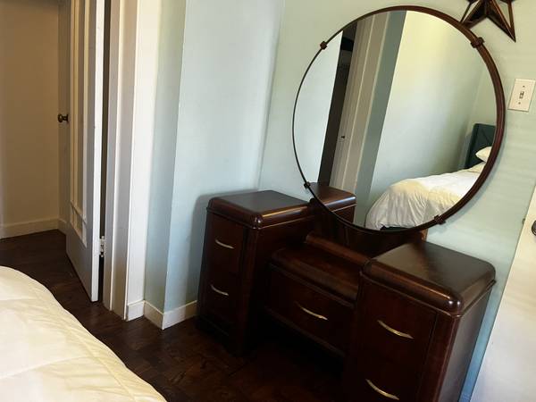 BEDROOM & HUGE WALK-IN CLOSET: One bedroom with queen bed, nightstand, peacock lamp, gorgeous antique vanity, tall dresser, and huge 10 foot walk-in closet.