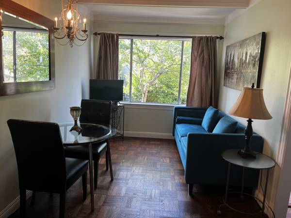 First floor 1BD Art Deco apartment with 10-foot walk in closet overlooking the courtyard and garden with a bountiful Meyer lemon tree, cherry tree, rosemary and rose bushes. Totally private apartment in friendly, quaint four-unit building. We kept a lot of the original Art Deco architectural deals including the beamed ceilings, arched doorways, parquet floors, designated workspace with built-in desk, built in “telephone seat”, built-in ironing board and huge floor to ceiling kitchen cabinets with custom built-in cutting board, purple and black tiled bathroom with huge soaking tub. Freshly painted in a relaxing light green color. Fully furnished. Turnkey ready. Keyless entry.