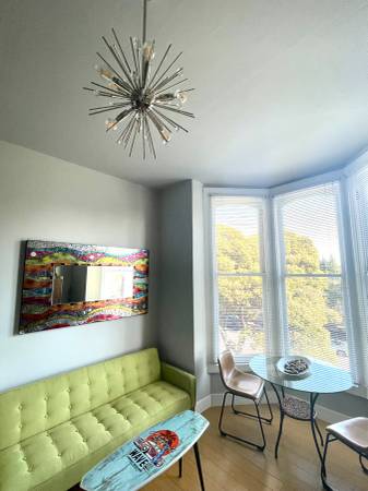 Come home to “The Dylan” inspired by mid-century modern surfer vibes…and one of my favorite actors. Enjoy the great city views and tons of natural light with relaxing cool blue, green and sunset colors. The Ocean Beach surfboard cocktail table says it all. Green convertible flips out into a guest bed because your friends are going to want to crash in this relaxing pad after a fun night out in the neighborhood. You are just a block up from all the great shops, cafes and restaurants on Fillmore Street. Several groceries stores are nearby. Our building scores 100 on Walkscore. Super easy and convenient to walk, take MUNI, or order a car service for pickup within minutes. Plus, there are great parks nearby including Lafayette Park which has a very nice dog park. This is a very nice, upscale and vibrant neighborhood.