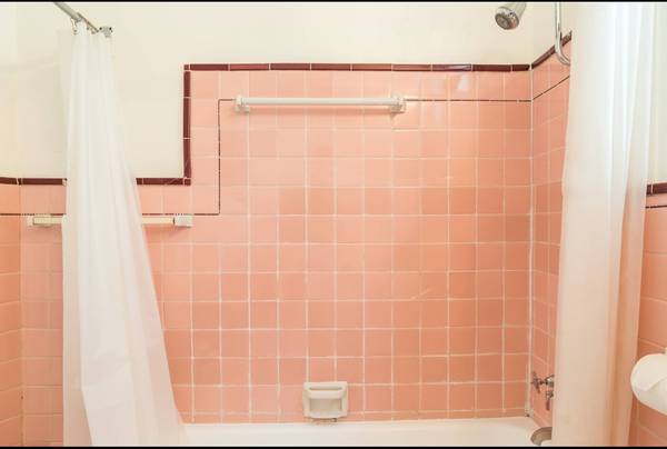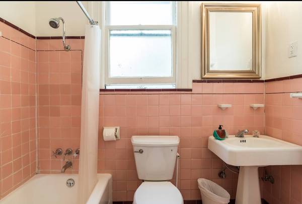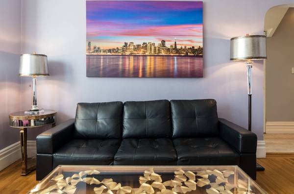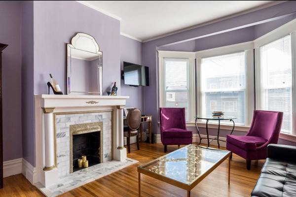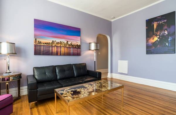 Living room has black leather sofa that pulls out into a bed (so you can even use this as a 5 bedroom--if you want.) There is a hall closet off the living room that people use when they are using the living room as a bedroom. Plus, there is a very pretty gold butterfly cocktail table, purple velvet chairs, dining table that can seat 4, fireplace, desk, 40″ Smart TV and an armoire. Big bay window.