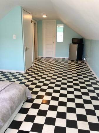 The top floor is almost like a private studio. Perfect for office space, extra bedroom or playroom. Currently, it is furnished with a bed and small fridge, but there is room for a desk, small sofa, etc.