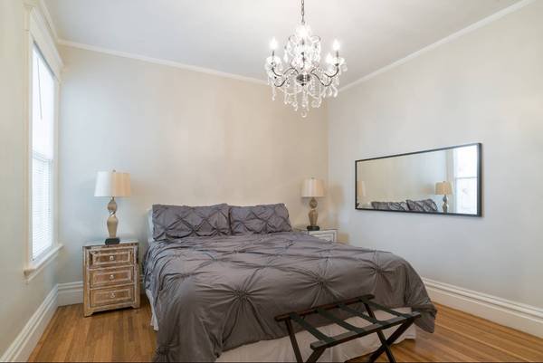Front bedroom has bay window, full size bed, nightstand, dresser and closet.