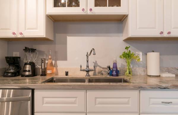 Large eat-in kitchen with stainless steel appliances and gorgeous granite counter tops that are purple, pink, blue and gold. Plus, there is a washer and dryer, dishwasher, gas stove, large side by side refrigerator that dispenses water and ice cubes, tons of cabinets. Marble dining table with bronze croc dining chairs.