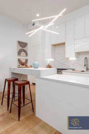 - Open floor plan living, dining & kitchen layout. European white oak wood flooring and tall ceilings.
