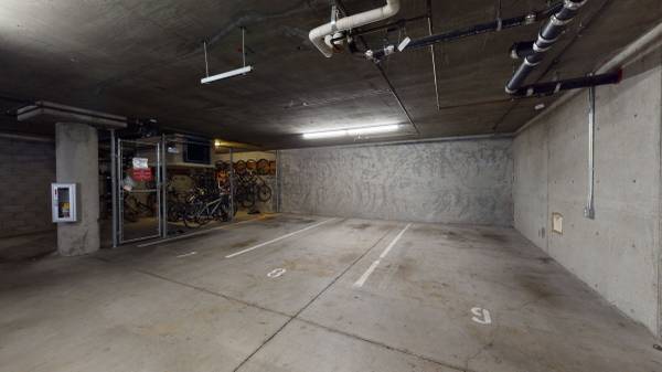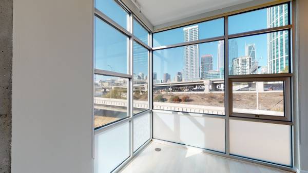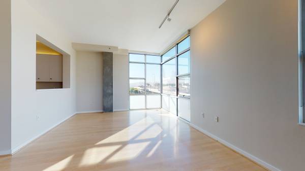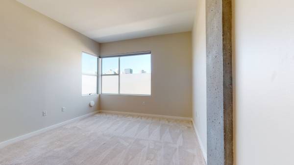 Bedrooms: Two large bedrooms, exposed concrete pillars and accents, oversized windows, guest bedroom with custom corner window, ample closet space, both with luxurious carpeting. Master bedroom with ensuite bathroom with lots of counter space, standing shower, huge walk in closet custom corner window with extra high ceilings!