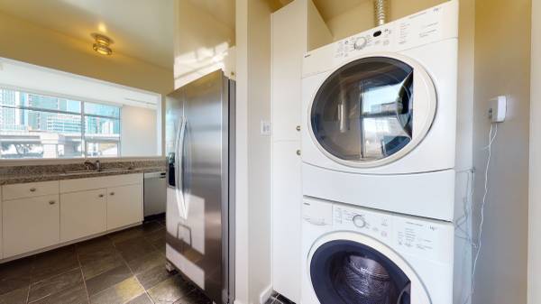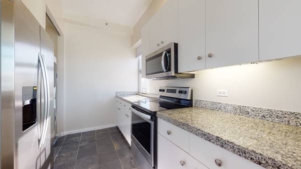 Kitchen: Large l-shaped kitchen with stainless steel appliance suite including refrigerator, dishwasher, electric range and microwave hood fan. Tile flooring, lots of counter space on the granite countertops and double sink with views from the floor to ceiling windows overlooking bridge and skyline. Perfect for entertaining with direct access to the living/dining room and large breakfast bar, extra corner window for added natural light!