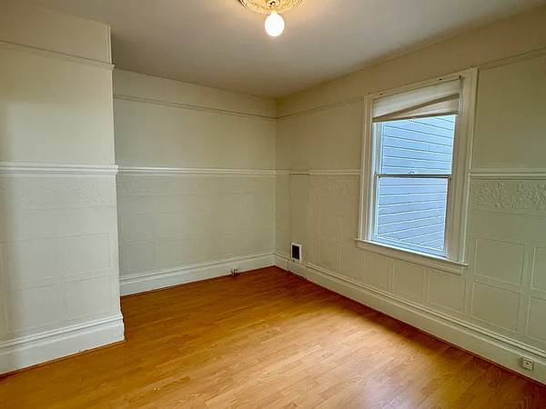 One-bedroom stand-alone cottage featuring views of the Golden Gate Bridge from the upstairs, located steps from Hyde and Polk Street. The property includes laminate flooring, abundant natural light, and a large eat-in kitchen. The layout consists of the kitchen and dining room on the lower level, with the bedroom and living room upstairs, which has a balcony. It offers a quiet, secluded environment suitable for a home office.
