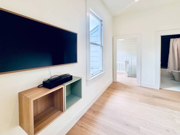 The south-facing back deck gets the evening sun. Stairs lead you down to a larger balcony, where we enjoyed many glasses of red wine and s’mores. The tiered yard has custom built-in planter boxes and irrigation for dwarf olive trees, grasses and Pohutukawa trees (NZ Christmas trees), creating a special space and offering privacy.