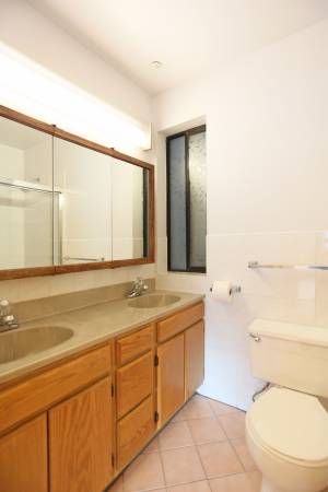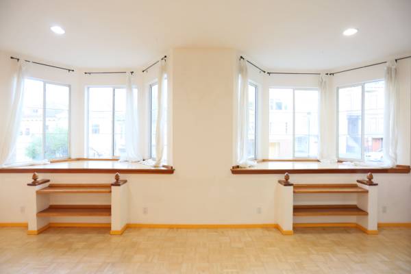 Elegant 3BR/2BA flat in the Sunset near the Haight-Ashbury neighborhood. Floors are hardwood, carpeted and tile. Heat is forced air. L-shaped, partially open living room has parquet hardwood floor, two large bay windows with seats and shelving, and a decorative fireplace with built-in shelves. Dining space is outside one of the kitchen's two doors, in front of one of the bay windows. Kitchen is in one corner of the living room. It includes gas range, double oven, dishwasher, and has lots of cabinets. Master bedroom is at the back of the flat, overlooking the yard. It is carpeted and has a short hallway with facing, sliding mirror door wall closets. It connects to the private bath. Bath has his-and-hers sinks and shower-over-tub with sliding glass doors. Second bedroom is adjacent to the master bedroom and also overlooks the yard. It is carpeted, has a wall closet with sliding mirror doors, and sliding glass doors opening onto the fire escape. Third bedroom is mid flat. It has parquet floor, washer and dryer in a closet with folding doors, and a standard closet. Shared bath has sliding glass doors and the linen closet is down the hall, next to the two rear bedrooms.