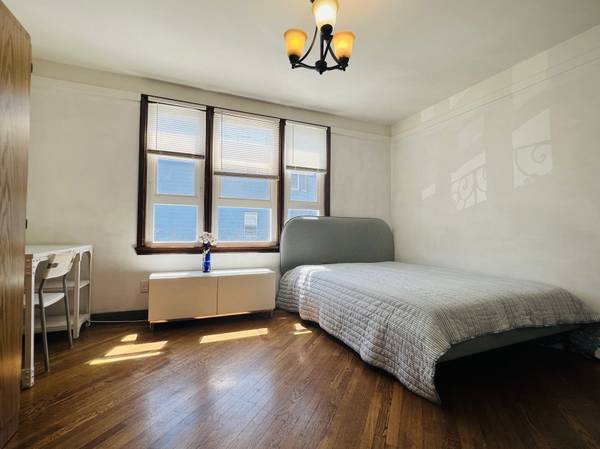 The room is spacious. It has lots of natural light. There is a desk and a chair in the room. Washer and dryer are on site, and not coin-operated.