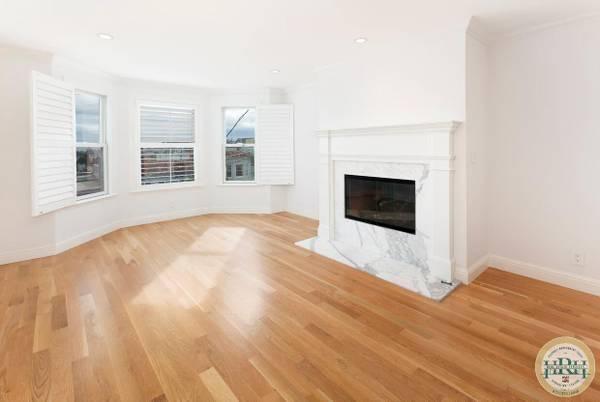 -Large living room with fireplace and bay windows