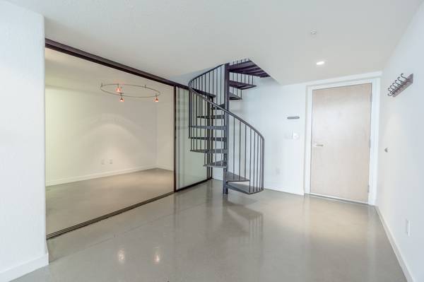 The main level offers an open-concept layout with a guest bedroom and full bath, a modern kitchen with a large island, Viking range, and wine cooler, plus a spacious living/dining area framed by double-height windows. Upstairs, you’ll find a remodeled bathroom, large closet, and a mezzanine bedroom overlooking the main level. A spiral staircase leads to the top-level penthouse room—ideal as a third bedroom, home office, or creative space.