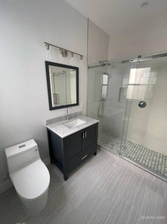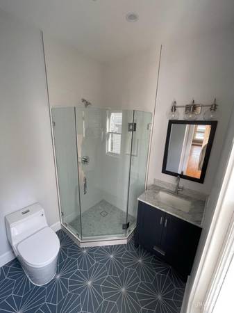 The appliances include stainless steel induction stove, refrigerator, dishwasher and disposal. Beautiful Quartz counters and a long breakfast bar for casual dining.