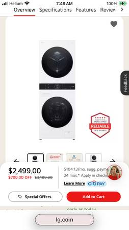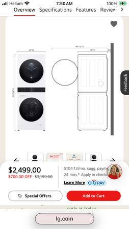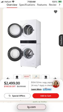 *LG 24in Compact Ventless Heat pump Washtower Stacked Laundry Center 2.4cuft Front Load Washer and Electric 4.2cuft Dryer