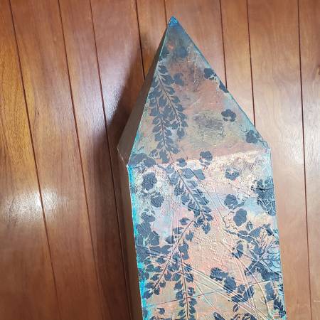 Estate sourced as local (SF) artistry, has all the details and style of a William Gatewood (came in with two of his panels). Same gold metallic and Eastern imagery indicative of his works, though not his usual medium to my knowledge. Hints of pastels and foliage ascend from the Olan-esque linework adding a Spring like vibe to the symbol of rebirth. Light in construction, with what appears to be a foamboard form, beneath layers of acrylic/putty.