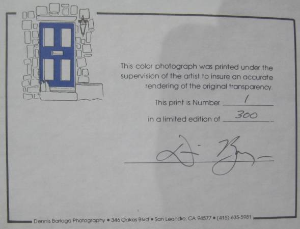 In 1979 Barloga opened the Dennis Barloga Gallery in San Francisco, California, which he ran until 1986. In that year Barloga took his first trip to Europe, and a new photographic interest was awakened by the architectural beauty he found there. Doors, windows, house fronts, storefronts, and café scenes all became new subject matter. “I was inspired to change my focus. I found that Europe’s villages, with their charming, everyday details, spoke to me. I always wonder what it would be like to live on the other side of a particular door or window.” During the past several years, he has continued to visit Europe to capture the quaintness of the villages on film, adding to his portfolio of images."