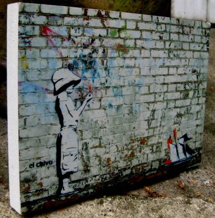 This is a photograph of stencil art by recognized street artist El Chivo. It is probably located in London. It is mounted on a hardboard. It is described as "Boy and Burning Boat".