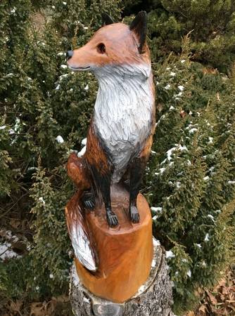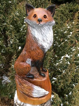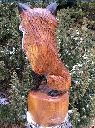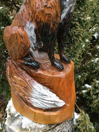Beautifully detailed carving from red oak. Burned and fully finished with 5-6 coats of zar oil based exterior polyurethane and painted. There is about 6" of checking along the back side....