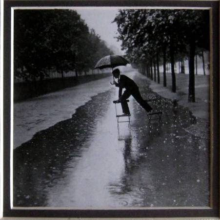 This is an offbeat period piece fine art black and white photograph from 1934 of a man crossing a stretch of floodwater with the help of two chairs after a storm caused flooding in The Mall of London, England.