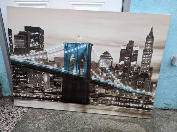 Hi. I'm selling my large Brooklyn Bridge And Manhattan Evening Canvas Print. In like new condition. This canvas artwork is printed to the highest standards onto premium canvas, then stretched by hand across a high quality pine frame ensuring the original character of the piece is represented. Very beautiful and modern. Fade resistant. Comes with hooks in the back for hanging. Dimensions: 39 1/2" x 1 3/4" x 27 3/4"H. Paid around $200. Selling now for $120. Cash only