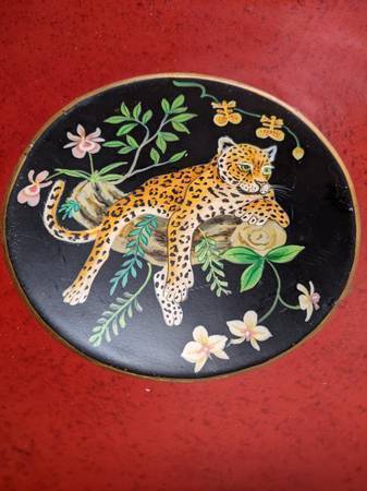 Hello. I'm selling my vintage 15"D giant wooden lion on the branch red bowl. Been with the family for over 40 years. In excellent condition. Very beautiful through out with a lion resting on a branch with flowers in the middle of the bowl. The side is painted black with 4 lions evenly spaced out to add depth and beauty to the bowl. For decorative purpose only. Perfect for your home. This antique will add beauty and elegance to anywhere you place it. Very rare. Dimensions: 15"D x 4 3/4"H. Selling for $50. Cash only
