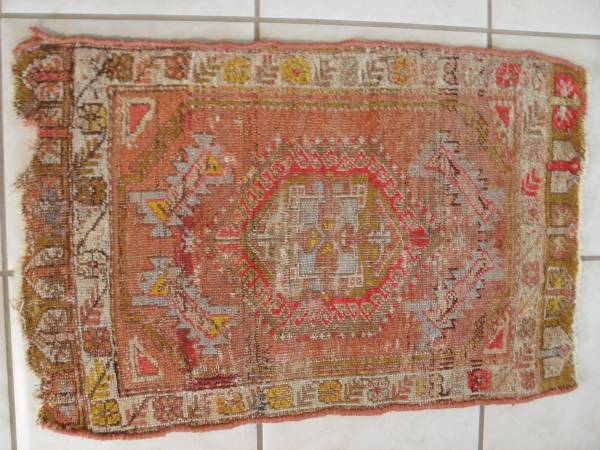 Add a touch of vintage charm to your living or studio space with this beautiful antique handwoven. THIS IS A RARE HANDMADE TURKISH OUSHAK RUG. MEASURES 32" BY 21". ADD A TOUCH OF VINTAGE ELEGANCE AND GLOBAL CHARM TO YOUR SPACE WITH THIS ONE OF KIND HANDKOTTED MADE WITH COLORFUL WOOL AND COTTON FROM TURKEY. PRICE REDUCED FROM $85 TO $60 NOW.