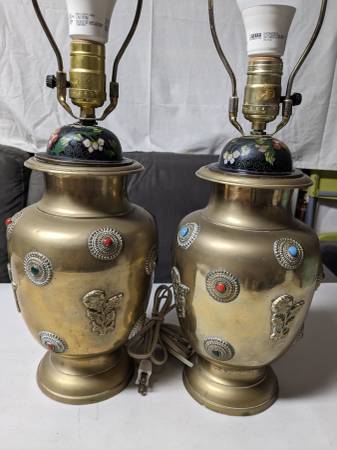 Hi. I'm selling my 2 Antique Rare Multi-Colored Chinoiserie Brass Table Jewel Lamps. In excellent condition. Works flawlessly. Circa 1940s. These lamps belong to my great uncle and they look beautiful and elegant. The body of the lamps are decorated with various color stones. Hand-painted and handmade. Made in Pakistan. No shades included. Dimensions: 7" x 20"H. Selling each for $200 or the set for $350. Cash only