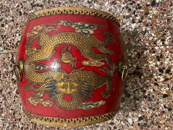 CHINESE LACQUER PAINTED WOOD DOUBLE HEADED DRUM BRASS DRAGONS. Great item. Chinese Ceremonial Dragon Drum in excellent condition. About 19 inches long and wide. If you are interested, please text me...