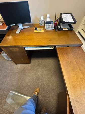 Desk is 33" deep x 60" wide x 29" high. The return is 19" deep x 42" wide x 27" high. It is very heavy and requires 2-3 people to move. It has a built in keyboard tray and extra storage shelves underneath. They literally don't make desks like this anymore. Extremely strong and study.
