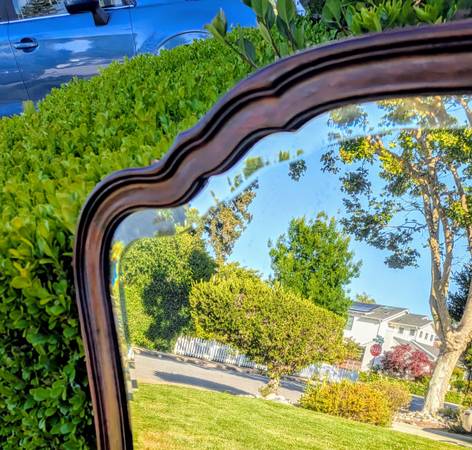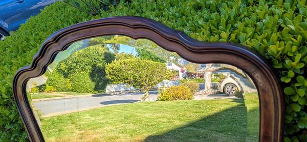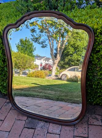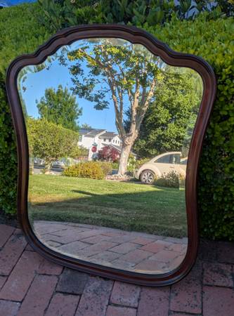 Graceful Art Noveau mirror with hand bevelled glass--frame is fine quality African mahogany, shaped gracefully in curved contours--displays many inside and outside curves dimensions: 32" height 26"...