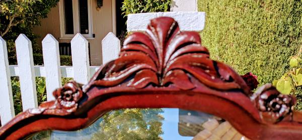 graceful mahogany tall mirror--hand carved crest with rosettes and acanthus leaves-- glass is hand bevelled--both inside and outside curves--sweet tall mirror! some minor flaws in glass, which is...