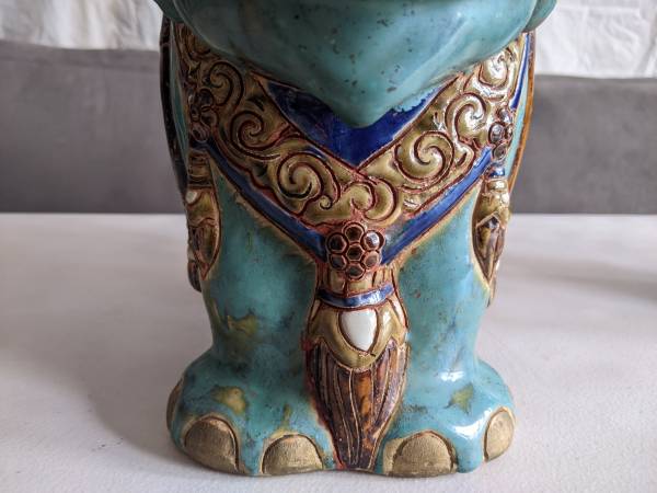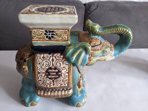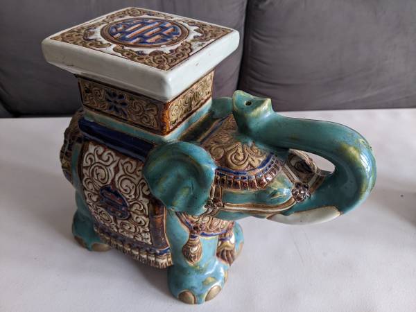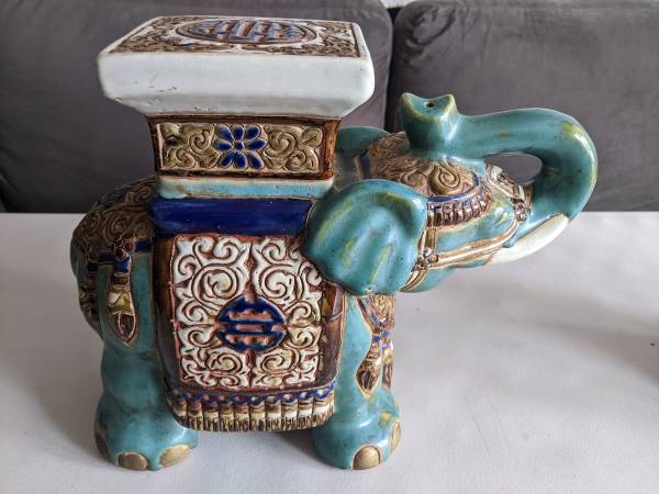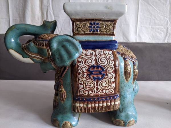 Hi. I'm selling a pair of beautiful vintage Hollywood Regency Chinese Green Elephant Garden Plant Stand or Seat. In excellent condition. No damage anywhere! Circa 1950s. Mid-20th century glazed ceramic elephant garden stool, flower pot seat or side table. All handmade and painted with vivid colors and details throughout. Nice addition to any home, patio, yard or garden. This is a rare collectible item. Been with my family for over 60+ years when my dad bought them from an antique shop. Dimensions: 13 1/2" x 5 1/2" x 11"H. Selling each for $700 each or $1000 for both. Cash only