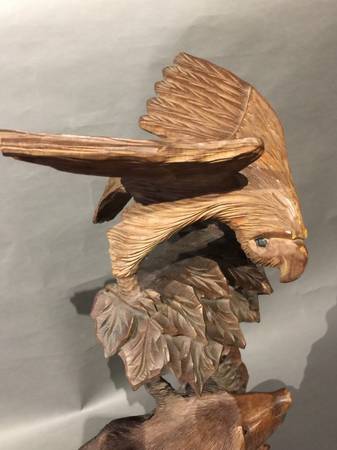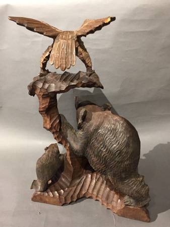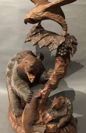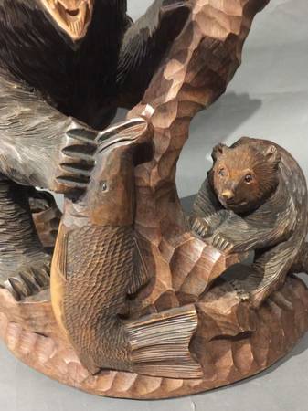 This is a very large wood carving of two bears and hawk with caught salmon carved in Hokkaido, the northern most island of Japan. The Ainu people of Hokkaido are well-known for their tradition of carving bears.
