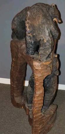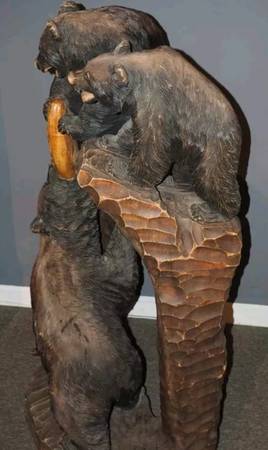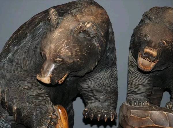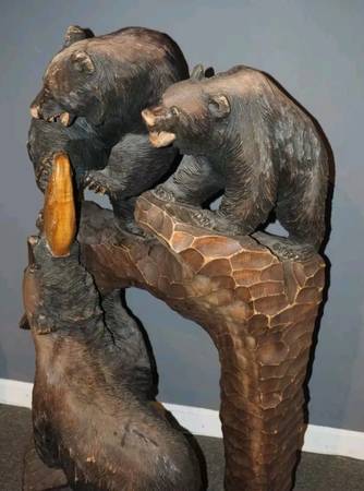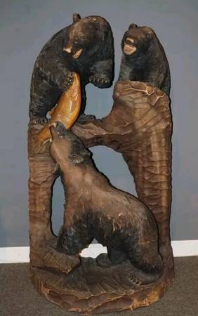 This is a very large wood carving antique of three bears with caught salmon carved in Hokkaido, the northern most island of Japan. The Ainu people of Hokkaido are well-known for their tradition of carving bears.