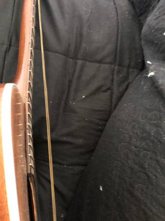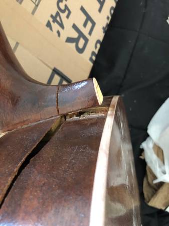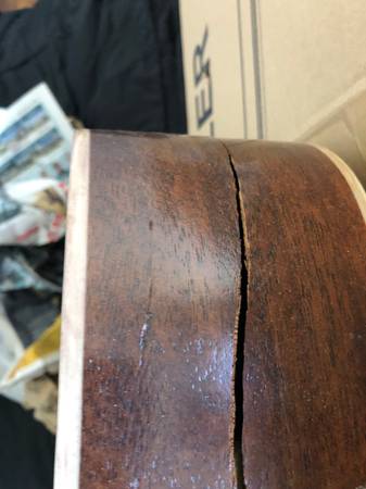 Here is a 1970s Harmony 12-string guitar that desperately needs repair. Bought the Harmony on eBay (around $300) - solid spruce top, mahogany body - but it broke in shipping. Photos show big crack...