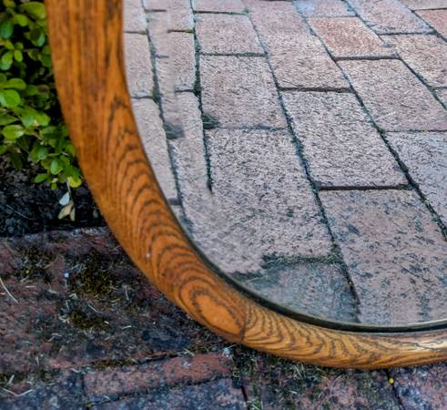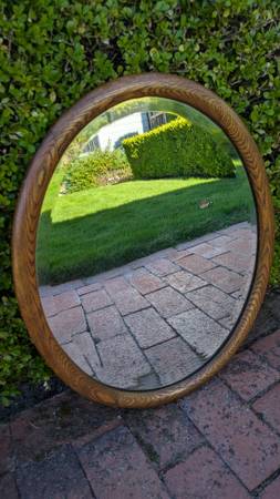 beautiful oak framed mirror with hand bevelled glass--designed to reflect head and shoulders image--the glass and wood frame are both in near perfect condition--the hand cuts are visible upon inspection of the surface of the bevel (when the sun is in the right location in the room, rainbows visit the room--