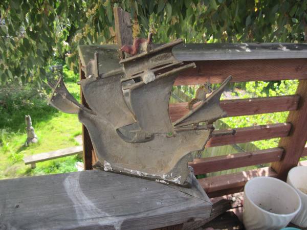 I believe cast iron but might be brass as it is heavy. Great decoration or door stop It is 13 and 1/2 inches wide and 10 and 1/2 tall