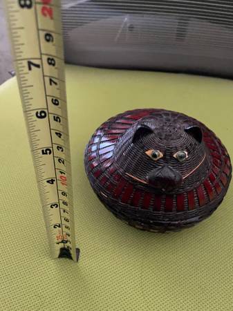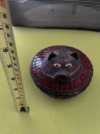 I am selling Vintage Cat-shaped woven strow wicker basket, likely from the mid-20th century. Used for storage, sewing supplies, or as decorative items. Often attributed to Shanghai Handicrafts. If you are interested, please text me at show contact info