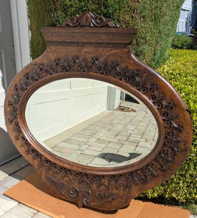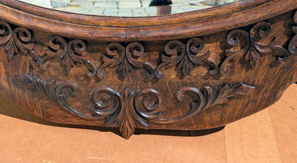 large scale piece--42" tall--33" wide--2" thick--professionally refinished in a rich dark oak color, the bevelled glass has been removed, carefully cleaned, and re-installed, new heavy duty eye screws installed, and strong chain for hanging