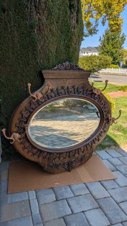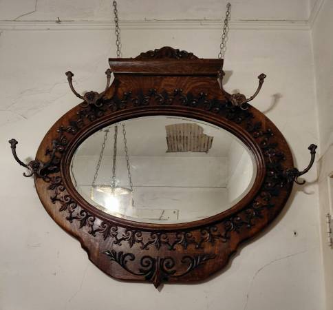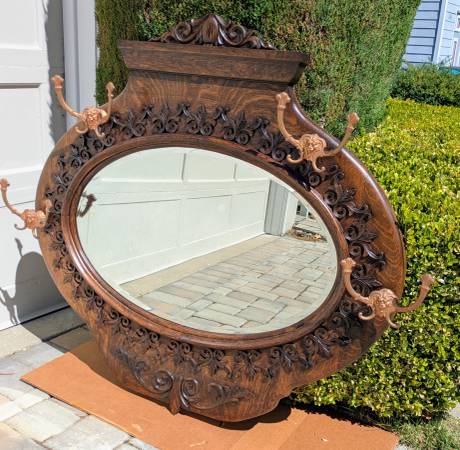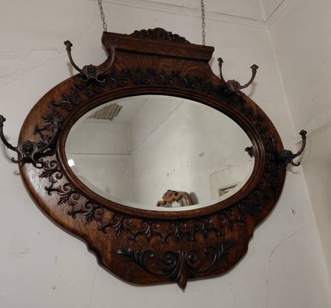 striking tiger oak mirror w/ hand bevelled glass--four original bronze coat hooks w/lions' heads--fluer-de-lis motif in all of the carving--beautiful design
