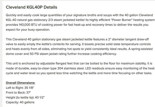 Cleveland KGL-40 Natural Gas 40 Gallon Stationary 2/3 Steam Jacketed Kettle - 140,000 BTU - New! Selling for $13990. Comes with a 30 day guarantee. This kettle was never used!